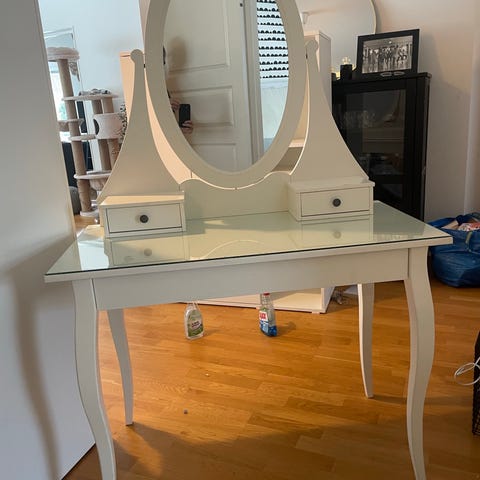 Charmigt toalettbord med spegel och tre lådor - en låsknappen behöver ersättas.