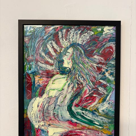 Abstrakt tavla målning i ram med flerfärgat motiv i rött, grönt, orange och vitt mot ljus bakgrund. Tavlan har en rektangulär form och är monterad i en tunn ram med guldfinish. Passar som väggdekoration i exempelvis vardagsrum, sovrum eller kontor. Mått 41x31 cm