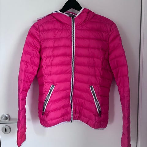 Typ övergångsjacka för vår eller höst. Fickor har dragkedja. Inga dun, men fylld med polyester.