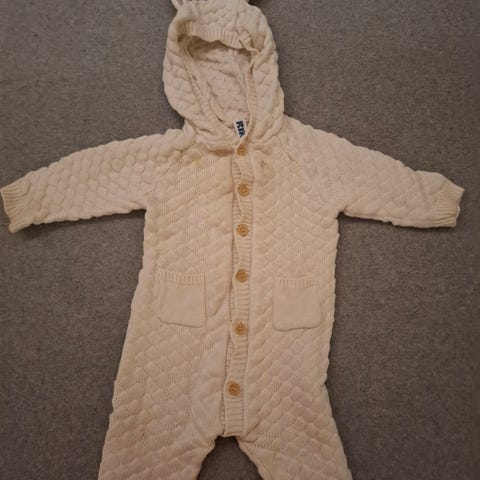 Stickad overall för barn från okänt märke i storlek 74, avsedd för pojke. Overallen är turkos och har huva, långa ärmar och långa ben. Den stängs med knappar framtill och har ribbade muddar vid ärm- och benslut. Stickat mönster framtill ger extra struktur och värme. Passar bra som ytterplagg under svalare dagar eller som varm lager-på-lager-overall för mindre barn.