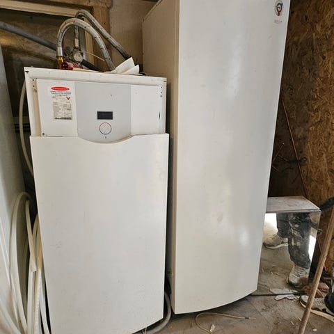 Fjärrvärmeväxlare Cetetherm mini SE som kan användas som reservdelar med ett vit skyddsskåp.