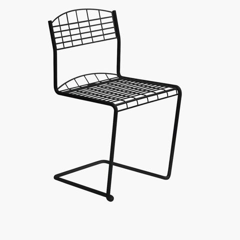Metallstol i svart färg med rundad sits och ryggstöd med vertikala ribbor. Stolen har fyra raka ben med små runda fötter. Passar exempelvis vid matbord, i kök eller på uteplats där en enkel och tålig stol önskas.