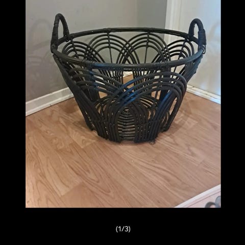 Handflätad korg av sjögräs med band av plast. Höjd utan lock ca 60 cm, med lock ca 90 cm, Ø ca 52 cm.
