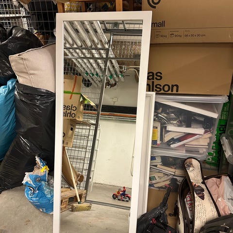 Vit väggspegel som inte kom till användning efter flytt. Kommer inplastad som på bilden.
