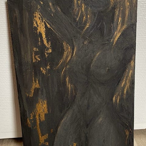 Egen målad spackel tavla med detaljer i guld och koppar. Går att vända på vilket gör att du kan hänga den i alla 4 olika håll. 4 tavlelbilder i en med andra ord!