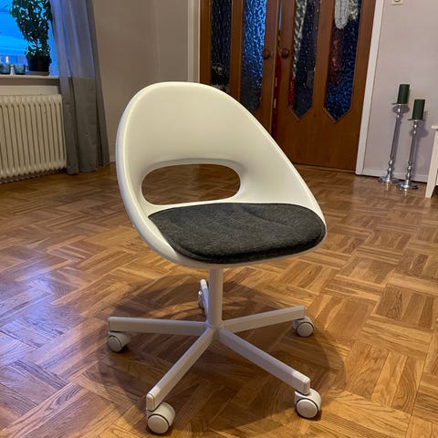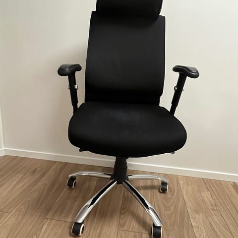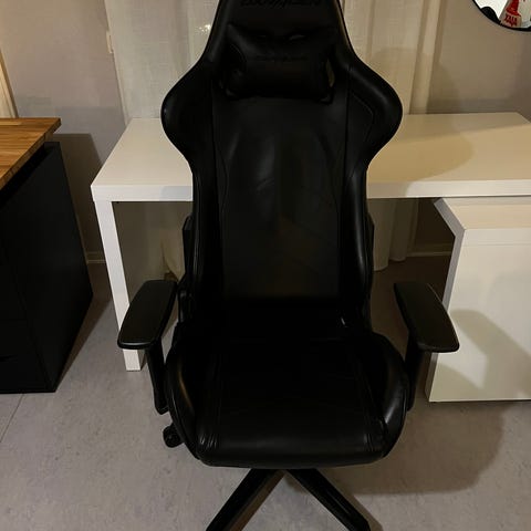 Arbetsstol / Gamingstol med svart vinylklädsel. Inställbar i höjd- och djupled, ställbara armstöd och höjbart nackstöd som även går att ta bort. Stolen har en liten reva i klädseln (upptäcktes först nu), samt ett skav på ena armstödet. Annars i bra skick.