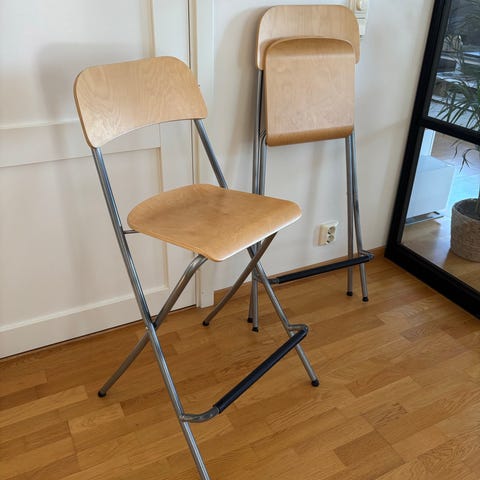 2 likadana barstolar med ryggstöd i metall och ljust trä, ihopfällbara. Hela och okey. Trät kan målas om ifall man vill. 150kr för båda. Finns en mil söder om Nässjö.