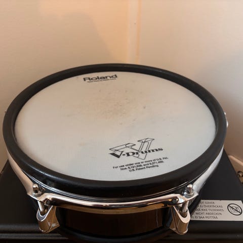 Roland trumplattor och cymbalpads för eltrumset. Trumplattorna har vit slagyta med svart kant och fäste för montering på stativ. Cymbalpaden är i svart gummi med hål för montering på cymbalarm. Passar som delar eller utbyggnad till kompatibla Roland eltrumset.