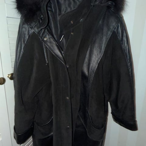 Svart kappa med huva och detaljer i konstläder. Kappan har knäppning fram och fickor. Troligen storlek 48 på etiketten står det 58. längd 114 cm, under armhålan 67 cm, armlängd 65 cm, axelbredd 44 cm