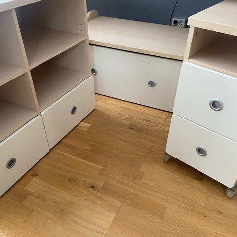 String skåp med lådor i vit färg. Skåpen är formgivna av Nils Strinning och ingår i String-systemet. Varje skåp har två lådor med runda handtag på fronten. Passar exempelvis som förvaring i vardagsrum, sovrum eller hall och kan kombineras med övriga delar i String-serien för ett sammanhållet förvaringssystem.