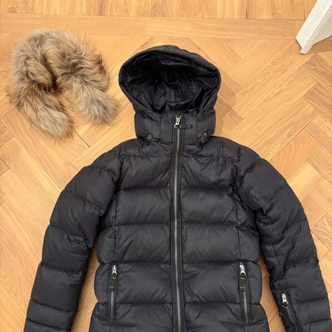 Jackan är mörkblå och har snölås i midjan.