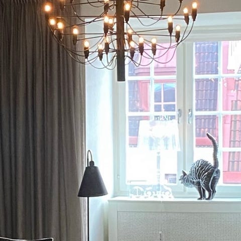 Säljer min fina taklampa, 88 cm i diameter. Går att justera längden på lampan. Lampan är tillverkad i metall med svart kromfärgade armar.