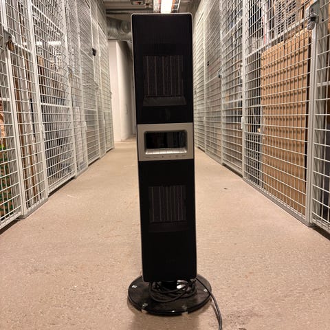 värmefläkt i tornmodell. Fristående enhet med rund fot i vit färg och svart frontgaller. Utrustad med kontrollpanel framtill med knappar för temperatur, timer, oscillation och av/på. På baksidan finns strömbrytare och nätkabel med stickkontakt för vägguttag. Lämplig för uppvärmning av inomhusmiljöer som vardagsrum, sovrum eller kontor. Tornformen gör att värmen sprids vertikalt och enheten tar liten golvyta.
