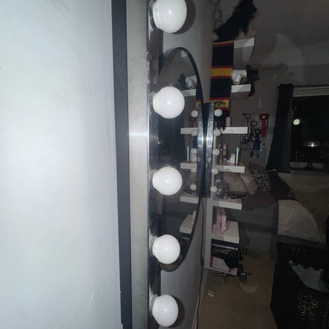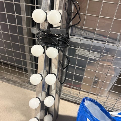 IKEA spegellampor med flera runda glödlampor monterade på en avlång list. Lamporna har sladd med strömbrytare och är avsedda att placeras runt eller vid en spegel för jämn belysning, exempelvis i badrum eller vid sminkbord. Passar för inomhusbruk.