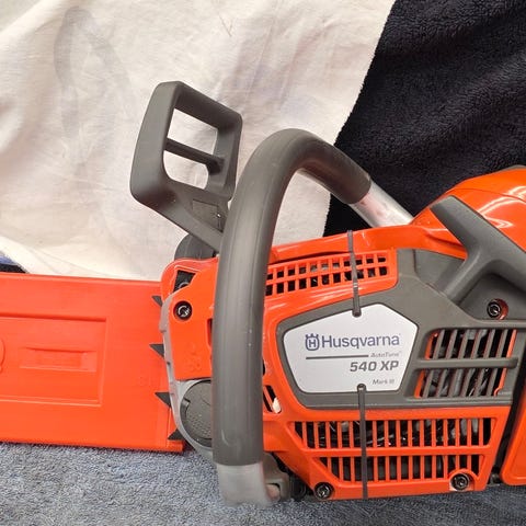 Husqvarna 234 SE motorsåg i orange färg. Bensindriven såg med svärd och kedja monterade. Sågen har främre och bakre handtag samt kedjeskydd. Passar för kapning av ved och allmänna skogs- och trädgårdsarbeten där en bensindriven motorsåg behövs. Ingen gnista, startar ej!