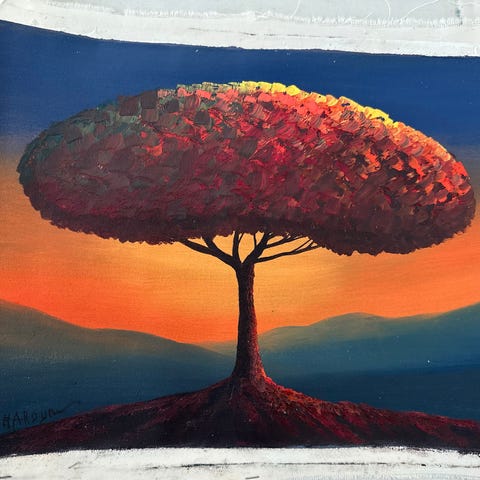 Tavla med skogsmotiv som föreställer ett par som promenerar på en stig i ett höstlandskap. Målningen visar höga träd med höstlöv och ljus som faller in mellan träden.