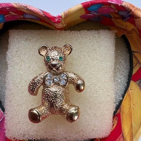 Vintage Panter brosch med rosa, mörkrosa och röda strass stenar på gul metall. 6 cm lång, 1,8 cm hög vid huvudet, bredd 2,5 cm vid framtassarna. Foton tagna i olika ljusförhållanden vilket varit svårt för att återge strass stenarnas färg på ett rättvisande sätt. Avhämtning eller frakt.