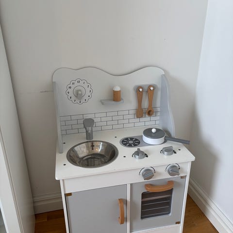 Lekspis i trä med rosa och vita detaljer. Utrustad med diskho i metall, kran, spisplattor och ugn med genomskinlig lucka. Överdel med hylla och panel samt förvaringshylla under bänken. Passar för lek i barnrum eller lekhörna och kan användas tillsammans med leksaksmat och köksredskap för rollekar i kök.