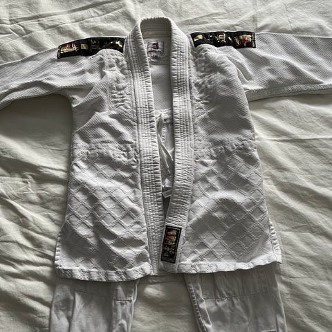 Adidas judogi kampsportsdräkt i vitt utförande. Dräkten består av jacka och byxa i kraftigare vävd textil anpassad för kampsport. Storlek L för herr. Passar för träning inom judo eller liknande kampsporter där judoliknande dräkt används.