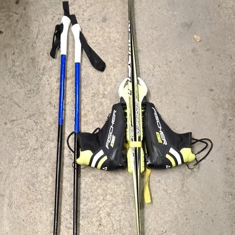 Fischer längdskidor med tillhörande stavar samt pjäxor i storlek 36. Skidorna är 130 cm, stavarna 100 cm. Finns i Sörmjöle.