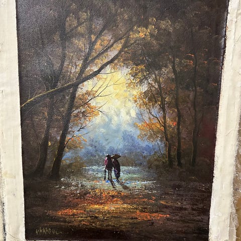 Tavla med motiv av ett träd mot en himmel i solnedgångstoner. I bakgrunden syns mjuka bergsformationer i blå nyanser. Färgskalan domineras av röda, orangea och blå färger.