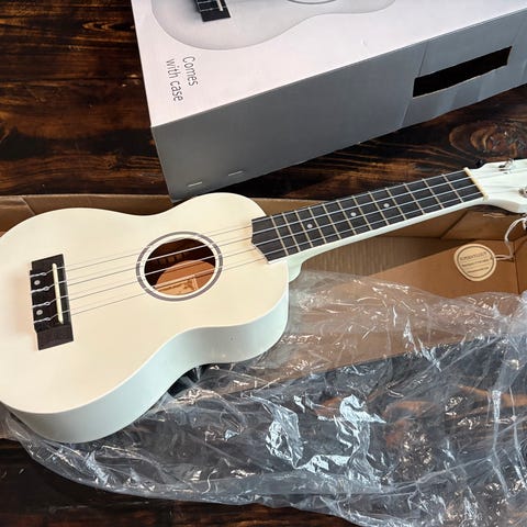 Helt ny gul ukulele med tillhörande fodral i originalförpackning. Har endast använts till en reklamfotografering.