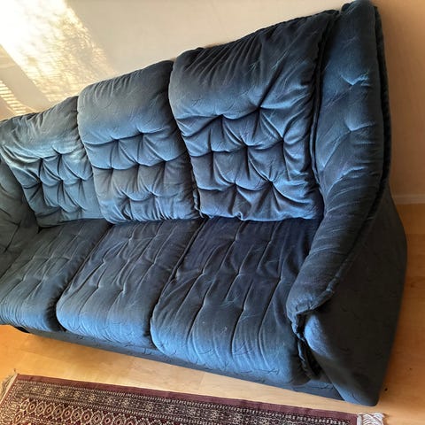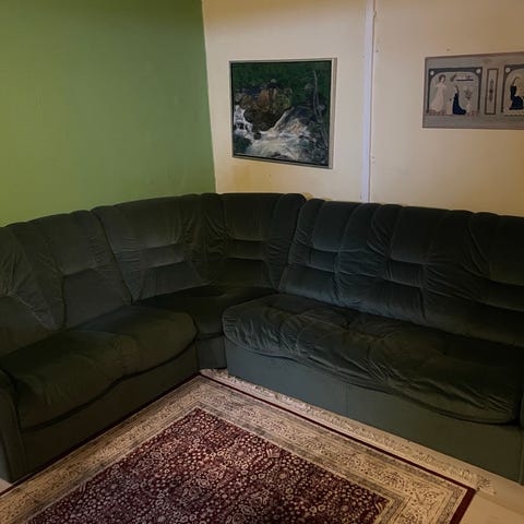 Hörnsoffa med sex sittplatser. Sittdjup 57 cm. Längd 265 x 220 inkl. armstöd.