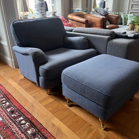 Mörkblå fåtölj i Howardstil samt tillhörande Howard Luxor Fotpall säljes, fåtöljen är i gott skick.