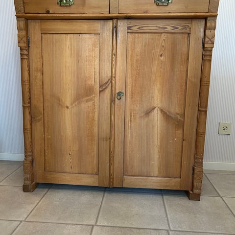 Sekretär i trä med klaff och flera förvaringsutrymmen. Övre delen har en nedfällbar klaff som kan användas som skrivyta samt ett öppet fack bakom. På sidan finns två utdragslådor för mindre saker. Nedre delen består av skåp med dörrar och invändig förvaring. Möbeln lämpar sig som skrivplats eller förvaring i vardagsrum, sovrum eller hall.