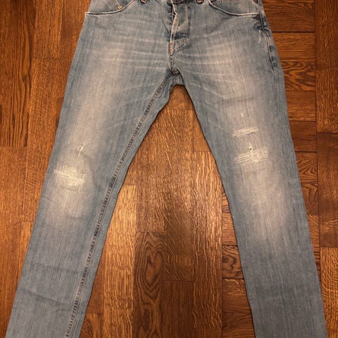 Säljer ett par blå jeans från Dondup med snygga slitningar och tvättade detaljer. Modellen heter George. Klassisk femficksmodell med raka ben och normal midja. Jeansen har kontrastsömmar och en patch i läder bak i midjan. Perfekta för en avslappnad och trendig look.