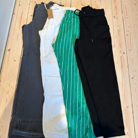 Byxor & Jeans, totalt 78 par. Alla i jeans 34 & byxor blandat 34/36 XS/S. Alla är inköpta 2025 men några 2024. De flesta oanvända och många med prislapparna kvar. Det mesta är inköpta på Gina Tricot,Zara,Lindex. Pris kan diskuteras vid snabb affär pga flytt. Kommer inte skickas då säcken med byxorna väger över 40kg