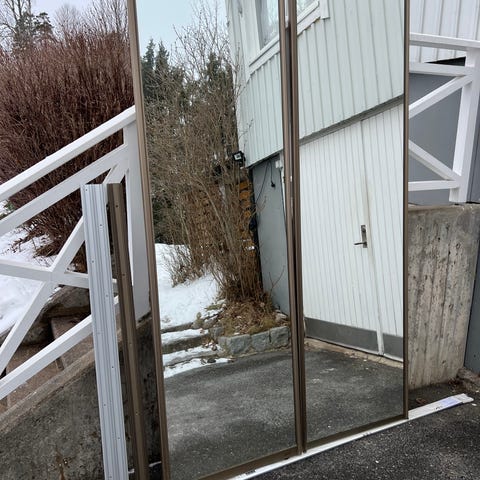 Skjutdörrar till garderob. En dörr är 231x101 cm. I mycket gott skick, vitaktig ljusbeige färg. Skjutmekanismen kan köpas ny på IKEA och är billig. Jag har originalmekanismen, men eftersom den har förvarats i källaren är jag osäker på om alla delar finns