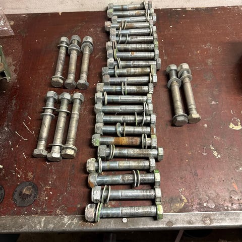 Skruv och mutter sats i stål. Bultarna är sexkantskruvar med muttrar och brickor, längd cirka 7 cm. Lämpliga för olika typer av montage och konstruktioner där genomgående bultförband behövs.