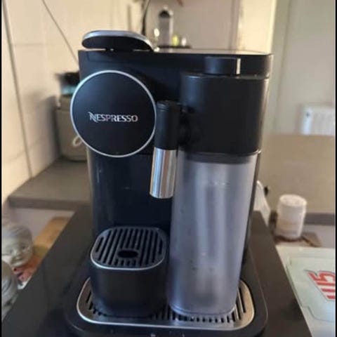 De'Longhi kapsel espressomaskin i svart utförande. Maskinen är utformad för Nespresso-kapslar och har en kompakt, rektangulär design med avtagbar vattenbehållare på baksidan. På ovansidan finns touchknappar för olika dryckesval. Fronten har droppgaller och utlopp för kaffe samt en separat behållare på sidan som kan användas för exempelvis mjölk eller vatten. Passar för tillredning av espresso och andra kaffedrycker med kapslar i hem- eller kontorsmiljö.