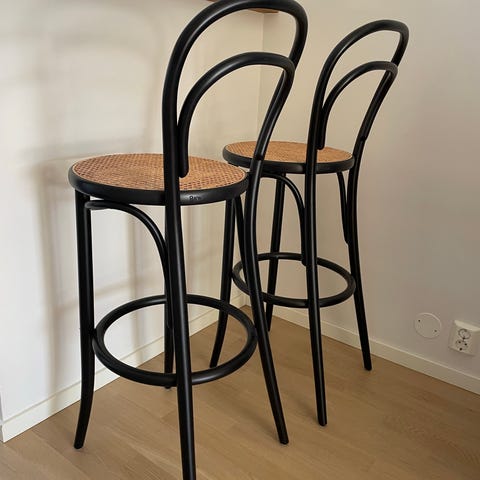 Två stycken barstolar från Ton. Rotting delen på ena barstolen har gått sönder.