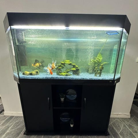 Det större akvariet kommer med två guldfiskar. Det är 120x42cm stort och 55cm högt. Skåpet har samma area som akvariet och är 73cm högt från golvet.