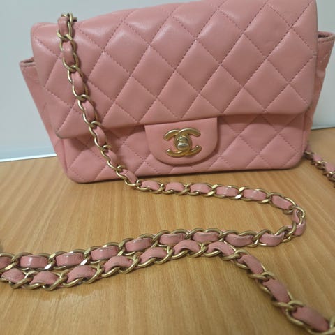 Chanel tygväska för kvinna i mörk textil. Väskan har tryckt Chanel-logotyp och text på framsidan samt metallknapp med logotypdetalj. Axelrem i kedja kombinerad med textil ger möjlighet att bära väskan över axeln eller i handen. Rektangulär botten ger stabil form och väskan lämpar sig för vardagsbruk med plats för personliga tillhörigheter. Färg och material framgår av bilderna som visar detaljer i tyg, metall och infällningar vid handtagen.