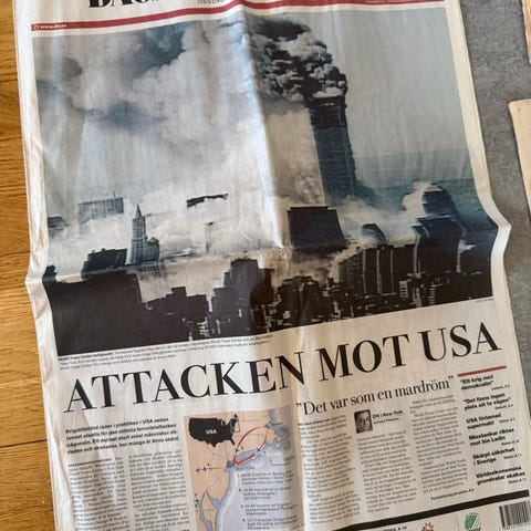Originalnummer av Dagens Nyheter från juli 1969 med den klassiska förstasidan “VI HAR LANDAT” efter Apollo 11 månlandning med Neil Armstrong och Buzz Aldrin.