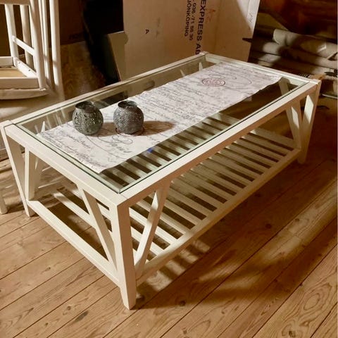 Glasbord i vitlaserad trä. 3 stycken .55x76cm.Höjd 55 cm. 1000 kr för alla 3.