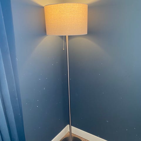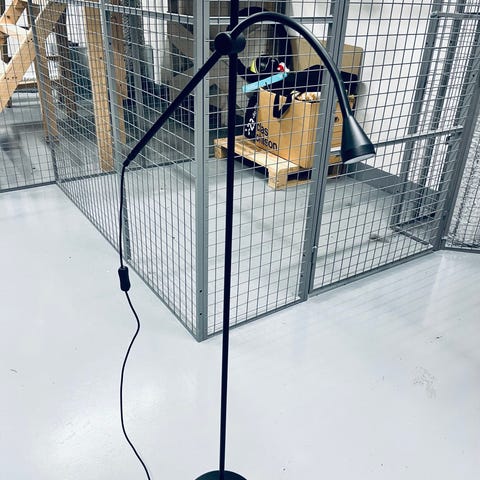 Golvlampa i svart metall med rund fot och konformad lampskärm. Lampan har smal, rak stång och kabel som löper längs stativet. Passar som belysning i vardagsrum, sovrum eller vid läshörna. Höjd 125 cm, skärmens diameter 50 cm, fotens diameter 25 cm.