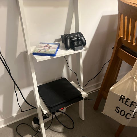 Mio hylla i form av steghylla i brunt trä. Hyllan har flera öppna hyllplan placerade på rad från golv till övre del, vilket ger plats för förvaring eller dekoration. Passar exempelvis i vardagsrum, hall eller sovrum där man vill utnyttja väggyta på höjden. Fristående konstruktion som lutas mot vägg vid användning. Pris går att diskutera.