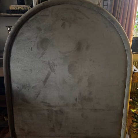 Mio sänggavel i grå textilklädsel. Rak, vadderad modell .