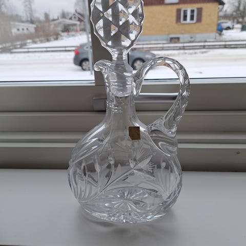 Karaffset i glas. Delarna är Böhmisk kristall. Dessa föremål är från Johansfors glasbruk och daterade till mitten av 1900-talet. Skålen med lock är från Åfors. Mycket fint skick.