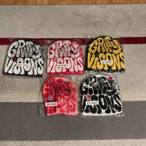 Gravy Visions mössa i två färger, röd och blå. Mössorna har tryck med text och stjärna på framsidan samt spindelnätsmotiv på baksidan. Passar som vardagsmössa under kallare väder. Material och storlek är inte angivna.