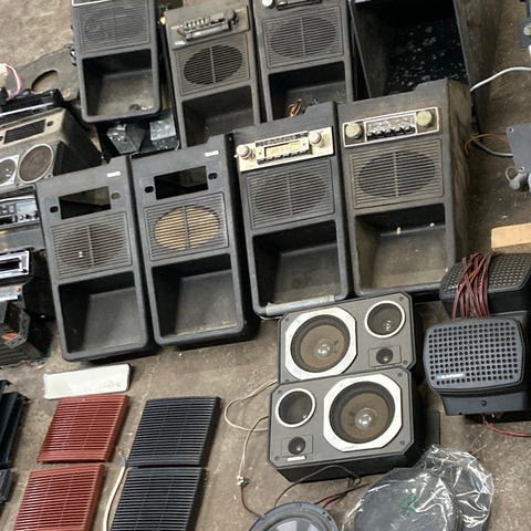 Knutsson bilstereo kassettbandspelare med två högtalare. Satsen innehåller kassettbandspelare för montering i bil, två separata högtalare samt kablage och fästen som syns på bilderna. Avsedd för uppspelning av ljudkassetter i bil och anslutning till medföljande högtalare. Passar fordon där det finns plats för inbyggnad av enkel bilstereoenhet och separata högtalare.