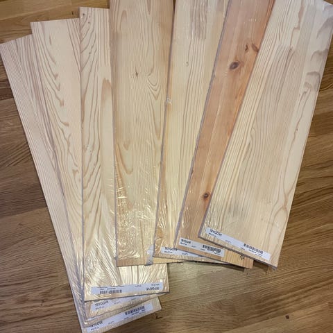 8 stycken hyllplan som har används som lagerhylla. Hyllplanen är betsade/målade och synligt använda men hela. Perfekt som lagerhylla eller om man ändå har tänkt måla om hyllplanen.