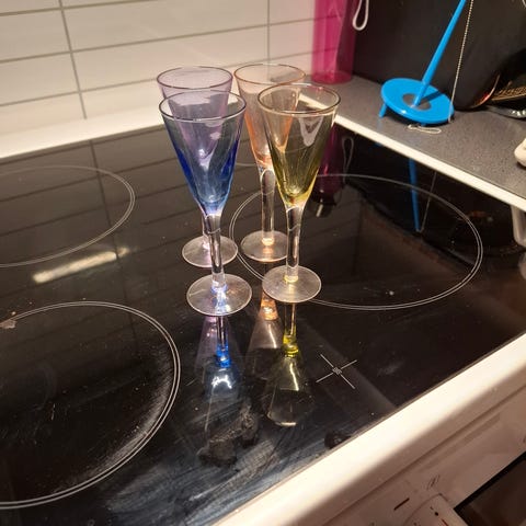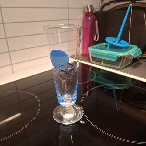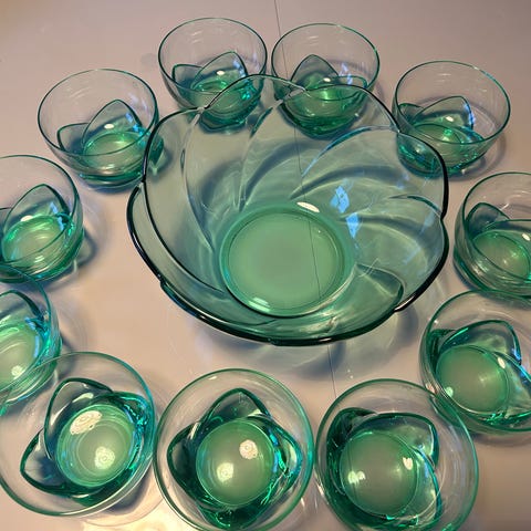 Duka kanna med glas i grönt och blått glas. Setet består av en större kanna med blått handtag och 10 stycken matchande dricksglas i gröntonat glas. Passar för servering av vatten, saft eller andra drycker vid måltider och dukning i hemmet.