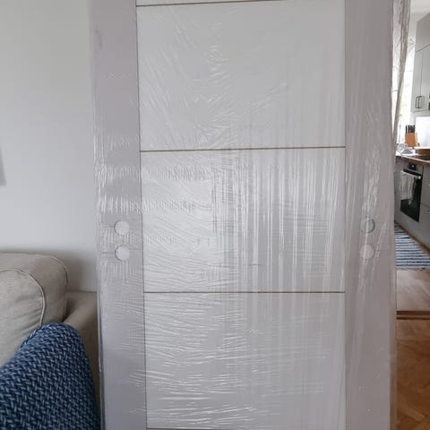 Vit skjutdörr säljs tillsammans med tillhörande beslag. Har suttit i vägg som monterats bort.