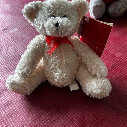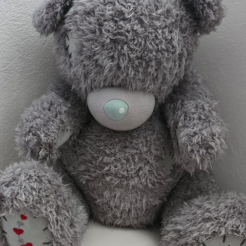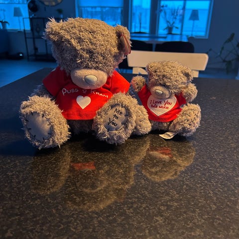 Teddykompaniet nallebjörn i grå plysch som håller ett rött hjärta med text. Mjukisdjuret är utformat som en sittande björn med broderade detaljer på tassarna. Passar som gosedjur eller prydnad i barnrum eller andra miljöer där ett mjukt kramdjur önskas.
