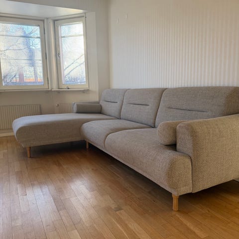 Både soffan och fotpallen är gråa men viss nyansskillnad finns. Avtagbar klädsel. Säljes tillsammans. Okej skick, inte ”synligt” använd men finns vissa skavanker därav lågt pris. Under armstöden mot insidan till har stoppningen hasat ner. Går säkert ordna om man orkar. Fullt brukbar iaf.